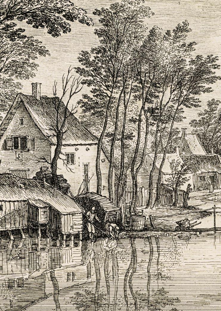 The earlier lowermost scene given a dark sky, partially through the use of drypoint. Now, smoke rises from the chimney. The trunks of the grove on the left behind the dead tree trunk more strongly shadowed. The lower corners of the composition supplemented. With the framing line (state B.b.II)