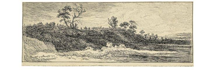 The earlier uppermost landscape given a sky, supplemented minimally at the sides, the embankment on the left crosshatched. A framing line is added. Still with the signature on the lower left. (state B.a.II = Winterberg 109,I)