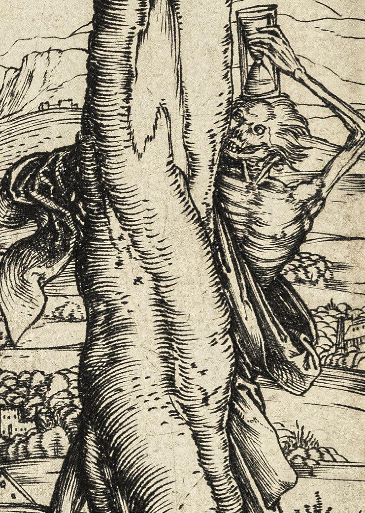 Das berühmte memento mori Barthel Behams gilt als his most striking illustration of the subject. (H. W. Janson). Inspiriert an Italienischen Vorbildern des ausgehenden 15. Jahrhunderts mit Darstellungen eines auf einem Totenkopf schlafenden Kindes, entwickelt Beham hier eine ganz eigene Interpretation des Themas unter dem Motto MORS OMNIA AEQVAT (Der Tod macht alle gleich):
