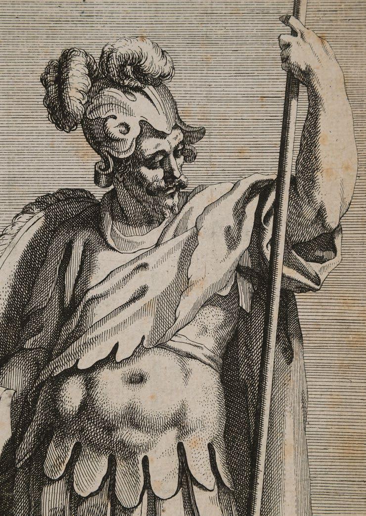 It is Jean LeBlond I’s intention here to introduce us to four sculptures of Roman deities that are certainly monumental, but at the same time extremely graceful in their individual patterns of movement. Despite their emphatically ample midsections, the elongated, ingeniously rotated figures of Ceres, Bacchus, Venus, and Mars seem almost to float, as though striving to ascend into the air from their pedestals, which bear inscriptions. Thus, they closely approached the stylistic ideal cultivated by J. Bellange at the court of the Duchy of Lorraine in Nancy in the early 17th century, as disseminated via his etchings. It is not unlikely that the anonymous etcher of the present sheet sought to emulate Bellange’s subtle etching technique, with its sophisticated combination of strokes and subtly modeled dotting when positioning his four Mannerist statues of deities before a uniform horizontal hatched background – just as Bellange had done with his Apostles a few years earlier.