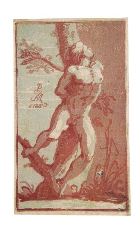 The composition is among the earliest chiaroscuro woodcuts by this artist. It was executed following Zanetti’s return from his two-year ‘Grand Tour,’ which took him to London via Paris in 1721. The ensemble of 130 drawings by Parmigianino he was able to acquire there from the collection of the Earl of Arundel would become an inexhaustible source of inspiration. They stimulated his intense preoccupation with the Italian chiaroscuro woodcuts of the 16th century, for which some of the drawings had indeed originally served as models. For his own virtuoso reproductions, Zanetti brilliantly invested the technique with fresh vigor.