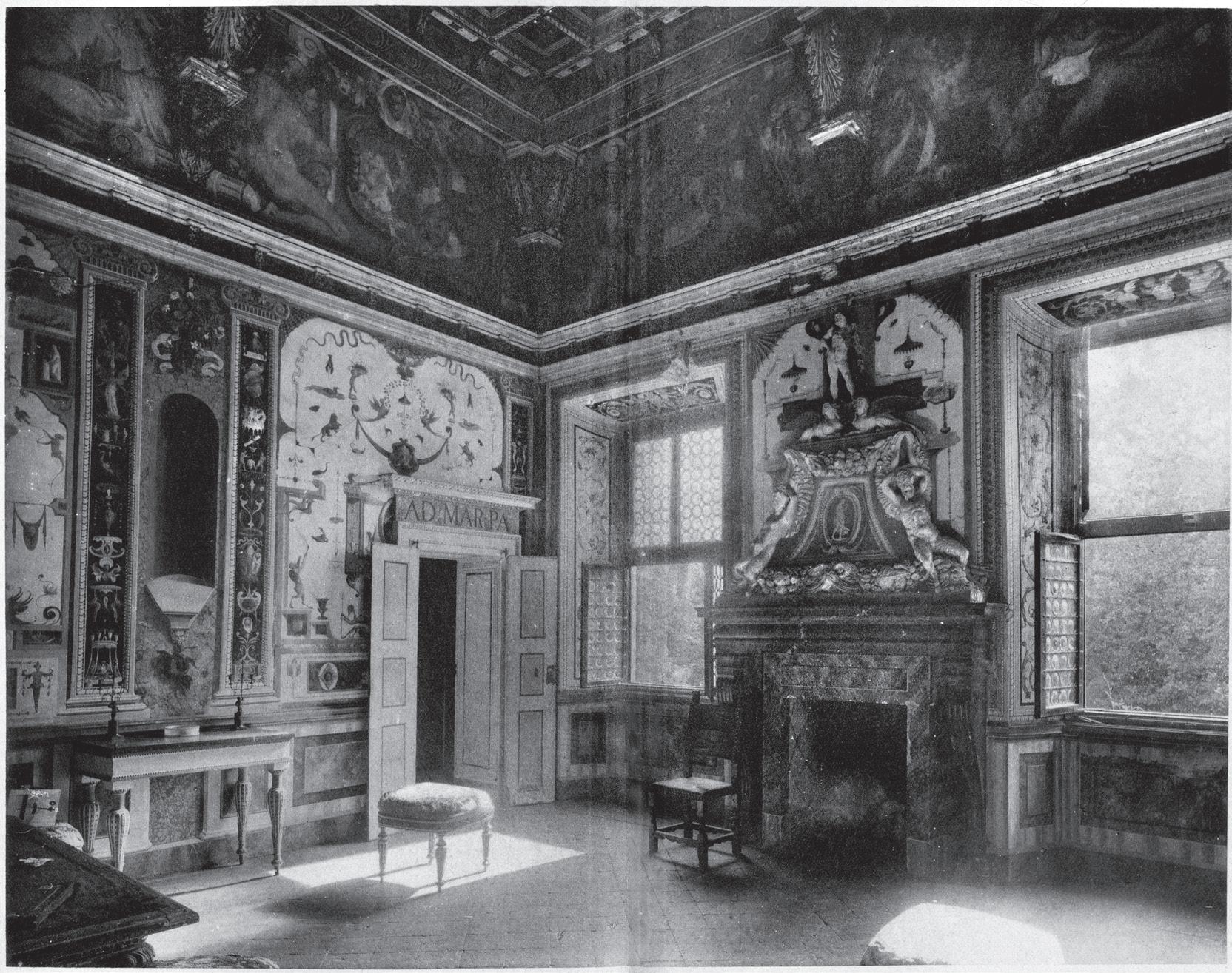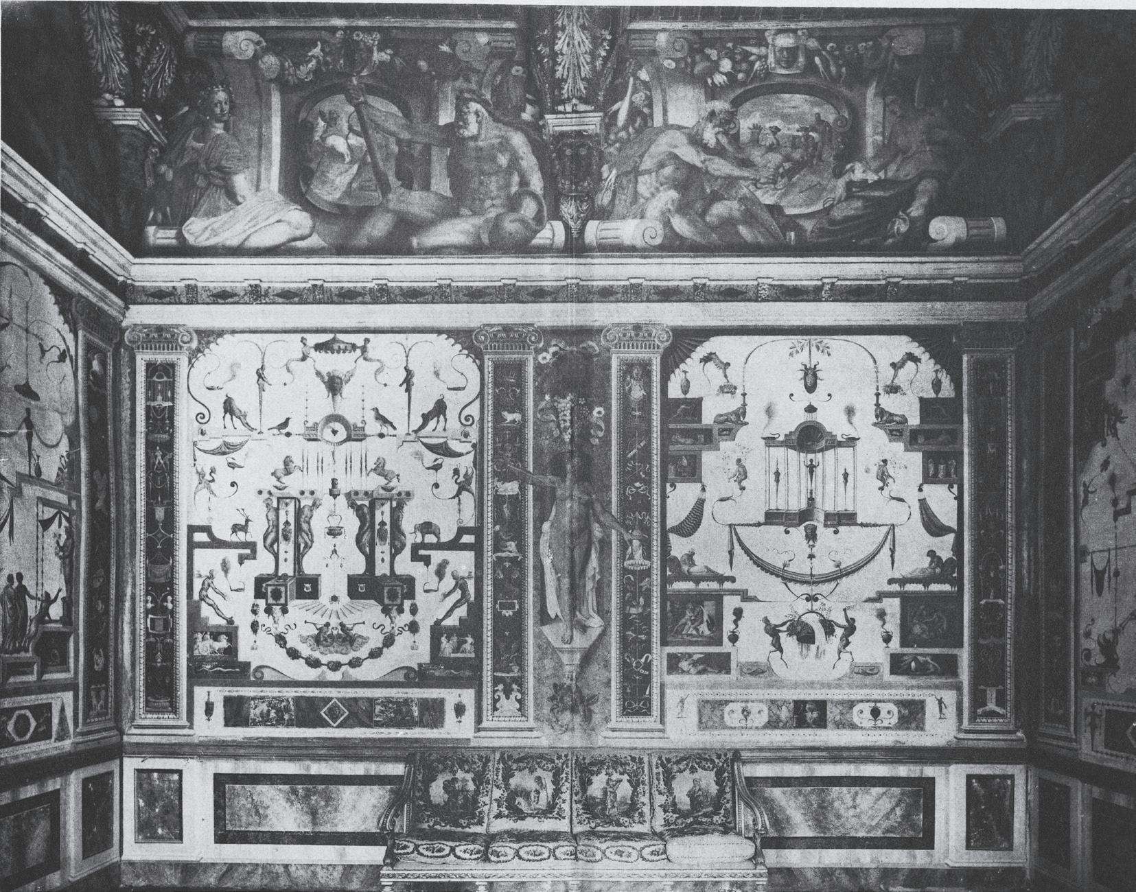 15 I motivi a greca sulle cornici ed i rosoni campeggianti nei cassettoni (si vedano le tavv. xlv e xlvii del Beltrami 1898) svolgono in modo più complesso e accusato quelli della vòlta del citato tempietto di Santa Margherita. Le grandi mensole a mascheroni che pendono ossessive hanno lo stesso fasto sontuoso e greve di quelle a mazzi d’acanto dorato nella Sala di Psiche del palazzo mantovano del Tè (cf. Hartt 1958).