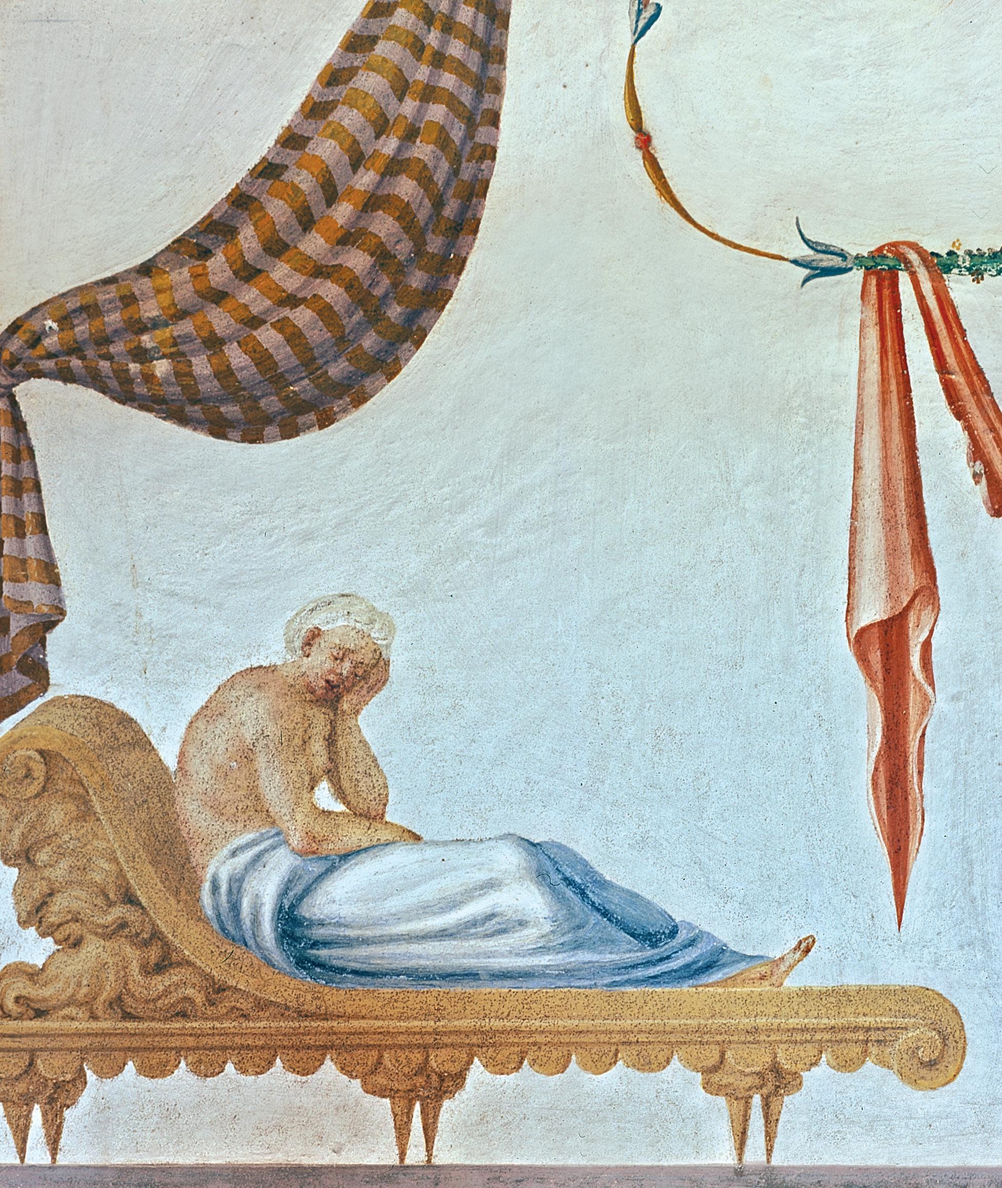 Nella sala quasi quadrata al piano superiore, l’illustrazione degli amori degli dèi, condotta in gran parte sulle Metamorfosi di Ovidio, si snoda per episodi lungo l’alta fascia alla sommità delle pareti, sotto un soffitto a cassettoni che è parte integrante della decorazione15. Pausate dalle mensole intagliate e fortemente aggettanti che sorreggono agli angoli e ai quattro bracci della crocera il soffitto ligneo, otto coppie