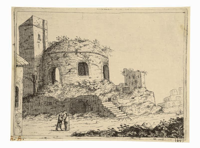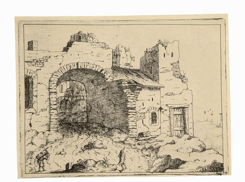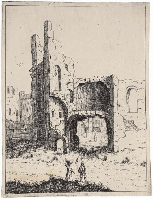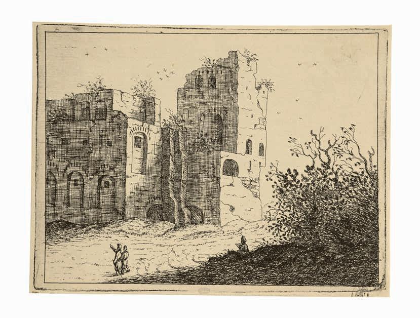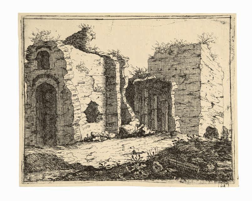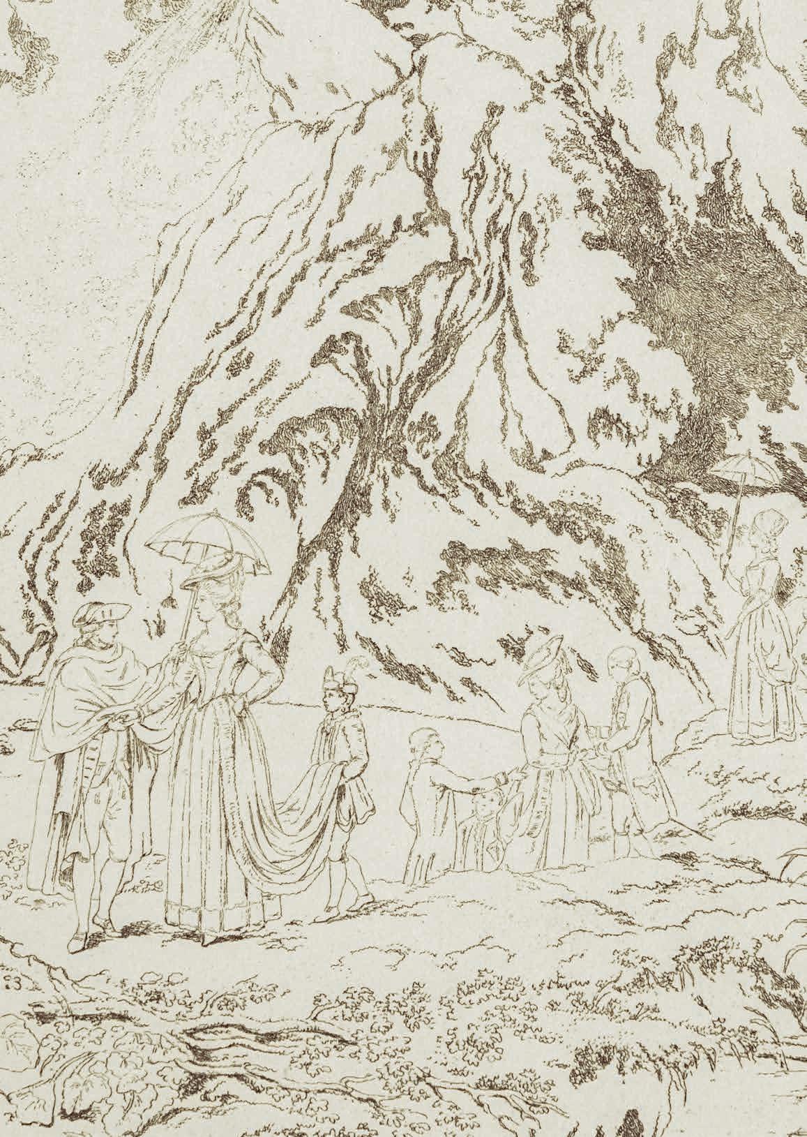 Bei zwei der acht Abzüge der Sammlung Liechtenstein handelt es sich um sogenannte Makulaturdrucke, d. h. Abzüge, die der Künstler während des Arbeitsprozesses von der bereits einmal abgedruckten Kupferplatte nahm, ohne die Platte zuvor erneut einzufärben. Obwohl diffuser im Druckbild, ließen solche Makulaturdrucke mitunter die graphischen Strukturen besser lesbar werden und erlaubten so dem Künstler, sich Klarheit über sein weiteres Vorgehen bei der Bearbeitung der Platte zu verschaffen. Dabei ging es nicht nur um Akzentuierungen der verschiedenen Schattenpartien, sondern auch um erwogene Abänderungen der Komposition selbst. So belegt ein Probeabzug unserer Gruppe, daß Weirotter die Wirkung seiner Personenstaffage ohne die Repoussoirfiguren des rechten Vordergrundes austesten wollte, indem er diese Gruppe versuchsweise einmal nur abgedeckt hat, bevor die Platte gedruckt wurde. Das Ergebnis scheint ihn gleichwohl nicht befriedigt zu haben, weshalb er die Figuren nicht auspolierte, sondern in den folgenden Druckzuständen weiterbearbeitete.