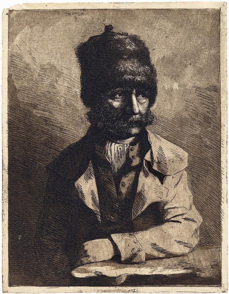 Signed only with Rembrandt’s monogram “Rf” (below the standing African woman, half-concealed by the shadow on the left) as a gesture of respect for the creator of its prototype, the sheet betrays nothing about its author, who transferred his impression of the drawing onto the copper plate using a variety of graphic textures. In effecting this medial transfer, the configuration of lines that shape the figure, along with its shadow, cast on the wall and on the floor, consists of strokes that are etched with differing degrees of intensity, becoming an almost unstructured, wild tangle of extremely fine hatching lines in the flesh areas. There are just a few, highly effective accents executed in drypoint, which attempt to convey something of the sfumato effect of the original. Also present is a remarkably intense, pronouncedly delicate surface tone that suffuses the entire composition, and which seems to reproduce the quality of the paper used by Rembrandt. This surface tone would appear to be less the result of deliberately leaving a thin film of printing ink on the plate during the printing process, and instead the result of a lavis etching across the entire surface of the plate, a process that makes possible only a small number of completely satisfactory impressions.