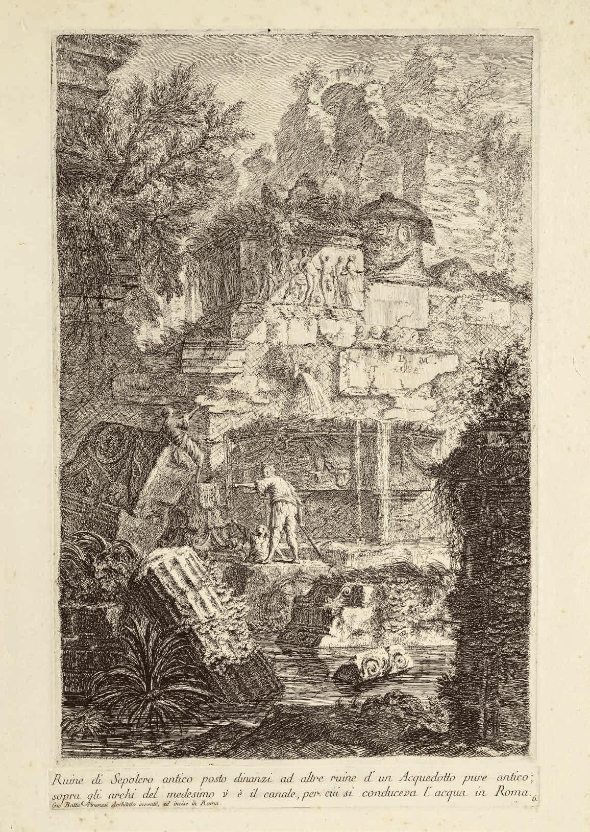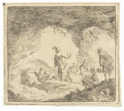 I. Reine Kaltnadel mit intensivem Grat, namentlich in den Schattenpartien an der Decke der Grotte als auch auf dem Boden, opak tiefschwarz. a. Makulaturdruck des I. Zustandes