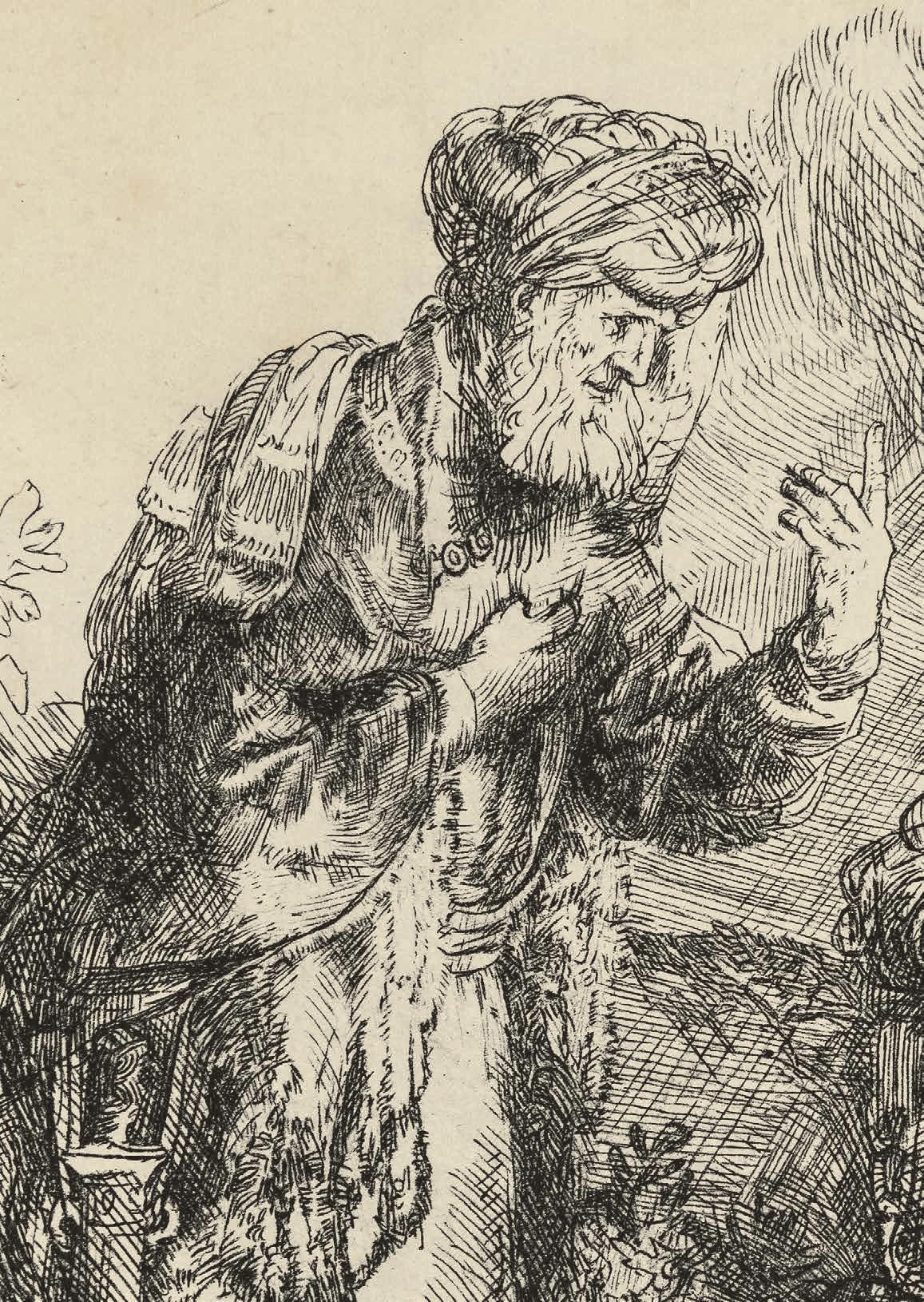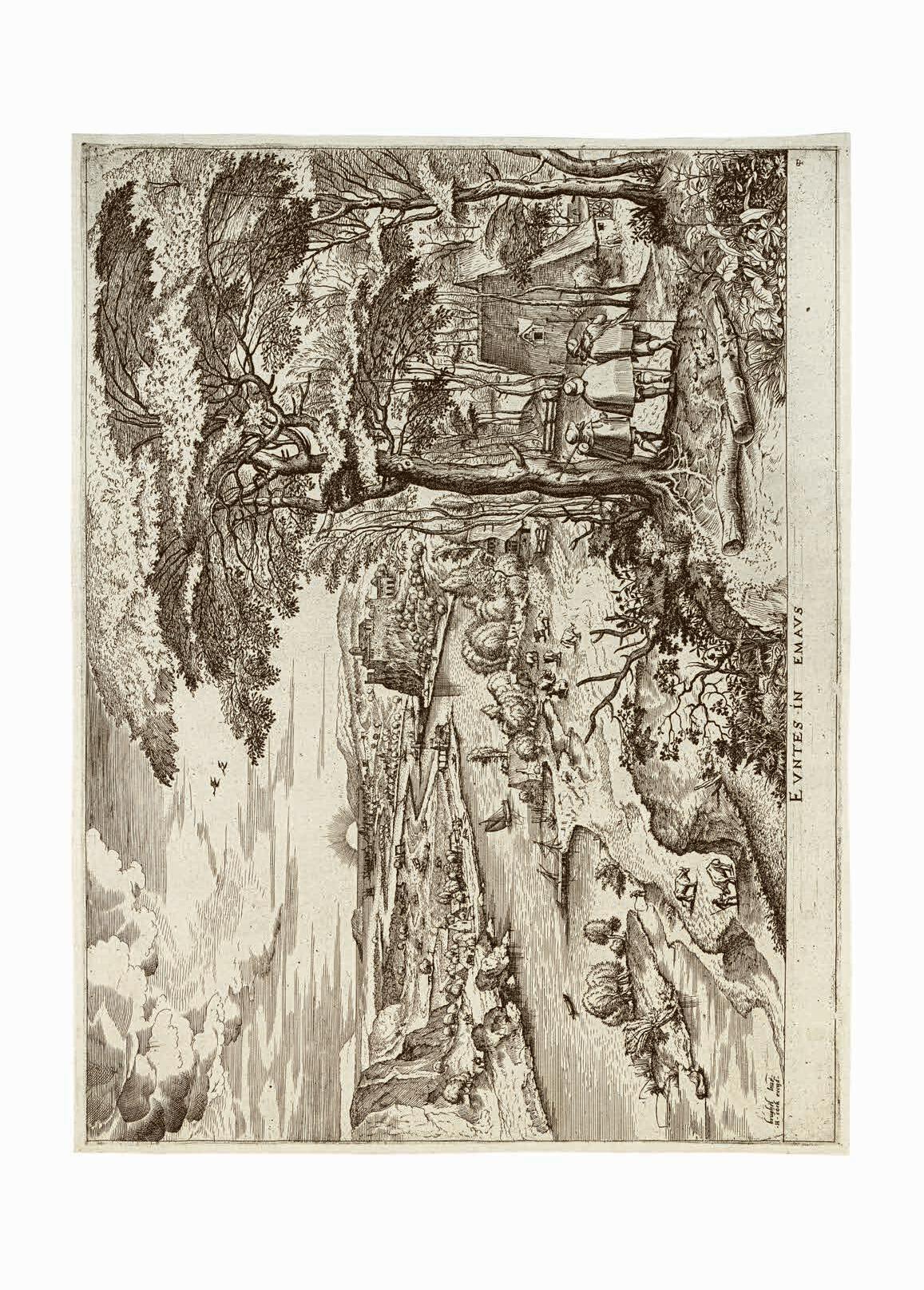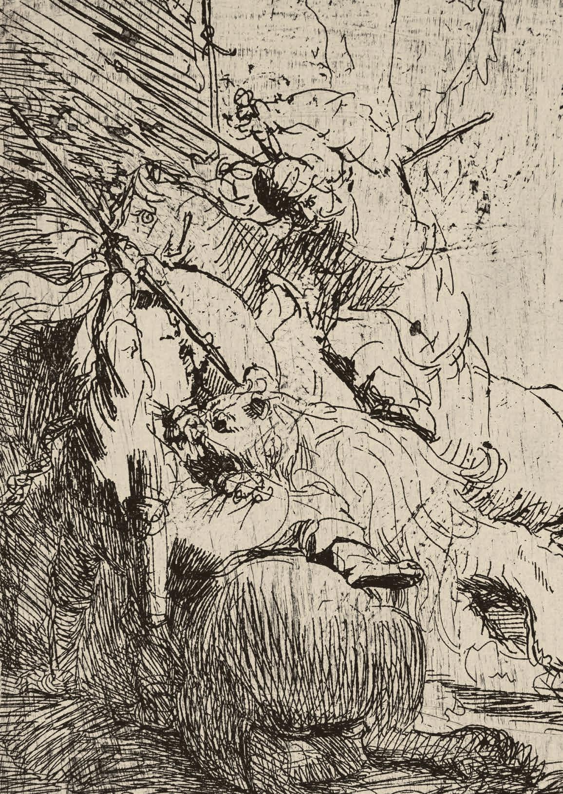 a. Abzug des III. Zustandes, bei dem die Repoussoirfiguren im Vordergrund rechts abgedeckt wurden. Im abgedeckten Bereich mit Graphitstift überarbeitet.