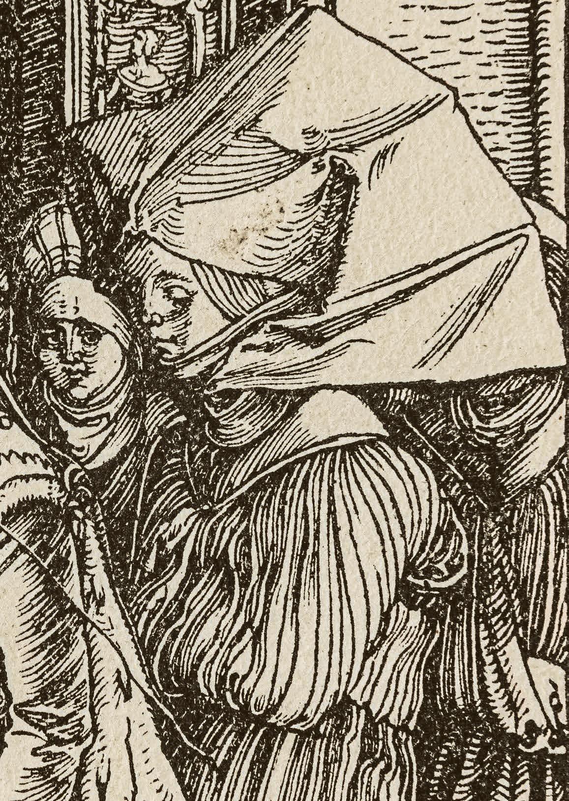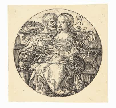The young Aldegrever has chosen a seemingly inhospitable setting for a rendezvous between a dandified gallant, already somewhat long in the tooth, and his young companion. For their lovemaking, the unequal couple has seated themselves on a hard wooden bench in front of a dilapidated picket fence that encloses scenery that is anything but a blossoming garden of love. They have come to an agreement, meanwhile, about the sweet fruit of love, embodied by the pear she proffers to him. His hand gives, her takes, as she fills the already bulging money purse that dangles conspicuously from her belt below a bunch of keys – while her suitor appears to be entirely under her spell, fixated on the anticipation of sensual delight, she fixes the viewer brazenly with her gaze, already on the lookout for her next client.