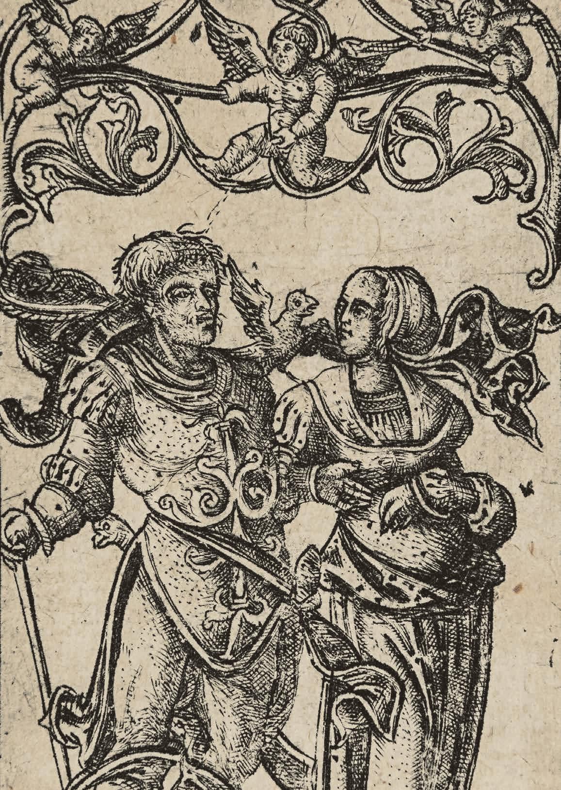 Amorous scenes such as this one, which grew out of the motivic complex associated with the Garden of Love, enjoyed great popularity in German and Dutch prints around 1500. Like another anonymous Dutch master known as “Master L,” the Master S. – who was presumably active in Antwerp during the first half of the 16th century – gave free rein to his imagination, devoting a comparable series of small, circular compositions to courtship between the sexes, whose diameters of circa 4-5 cm were only half the size of the small round engravings produced by the Master b x g. Like the sheets produced by the Dutch monogrammists, the present anonymous artist departs from the latter’s compositions, which unwaveringly depict an idealized version of courtly love, his compositions displaying instead an often satirical and occasionally even coarse undertone.