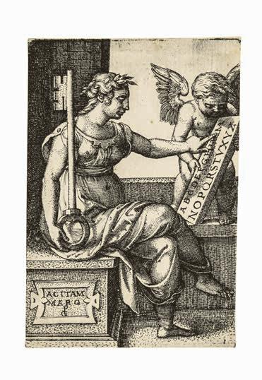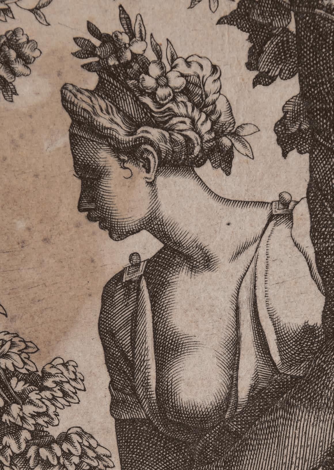 In contradistinction to both the Master S and the Master L, the engraver of the present delightful sheet – who we were otherwise unable to trace – worked in the tiny format of his tondo primarily with simple, and as a rule parallel strokes, which are only occasionally accented sparingly with some crosshatching, consistently ensuring the legibility of this somewhat salacious miniature.