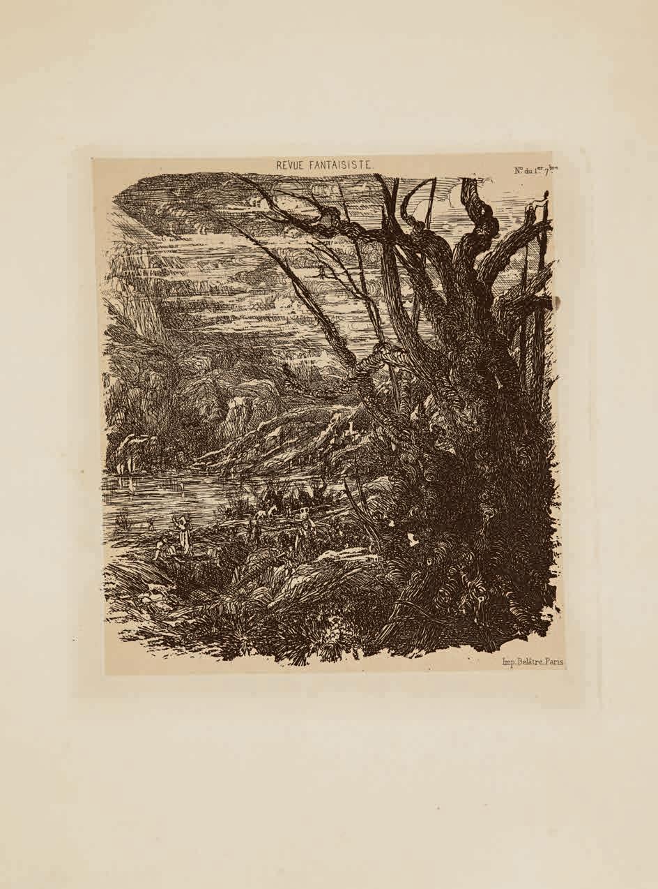 I. Pure drypoint with intensive burr, specifically in the shadowed areas on the roof of the grotto, as well as on the ground, which is opaque deep black.