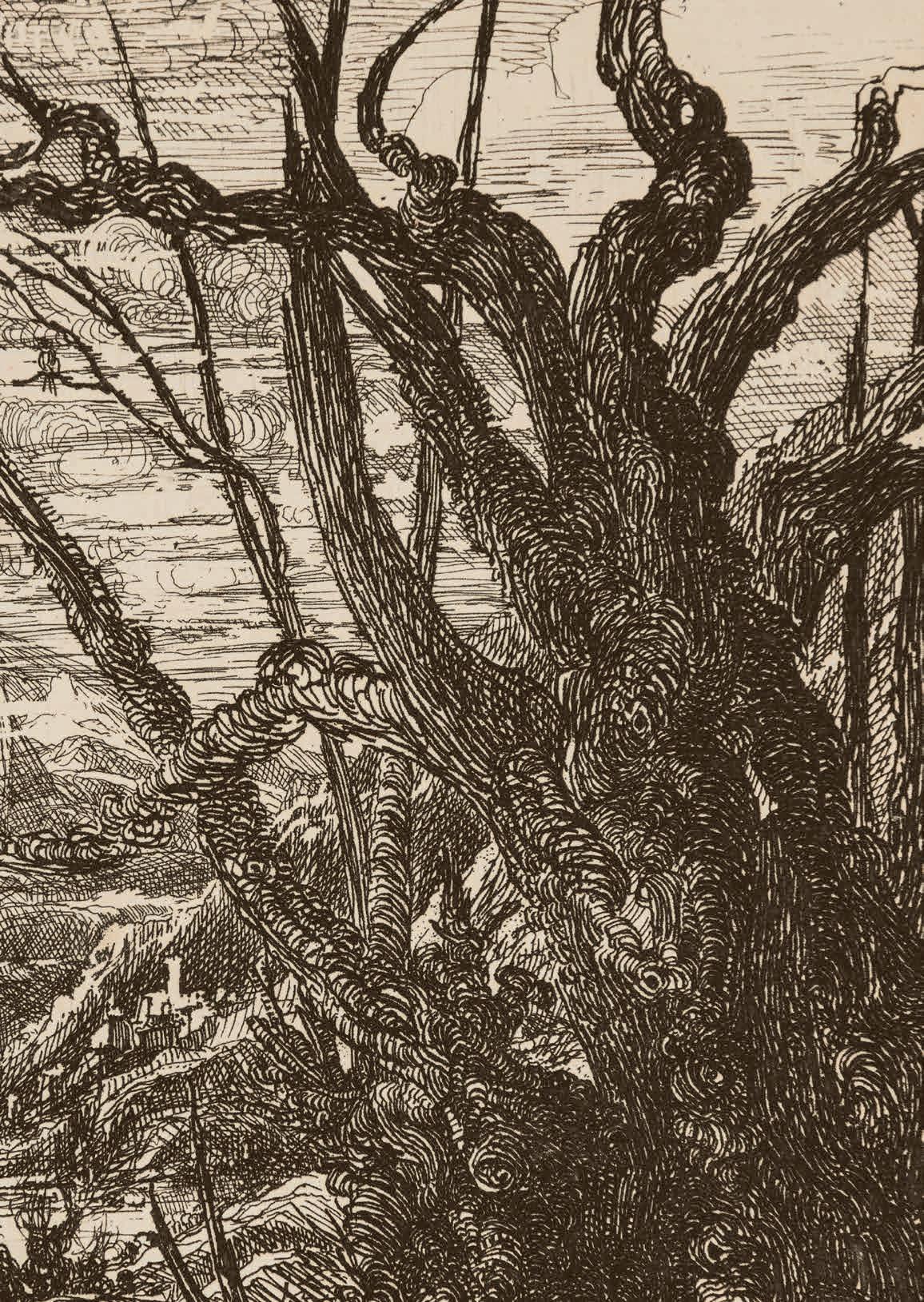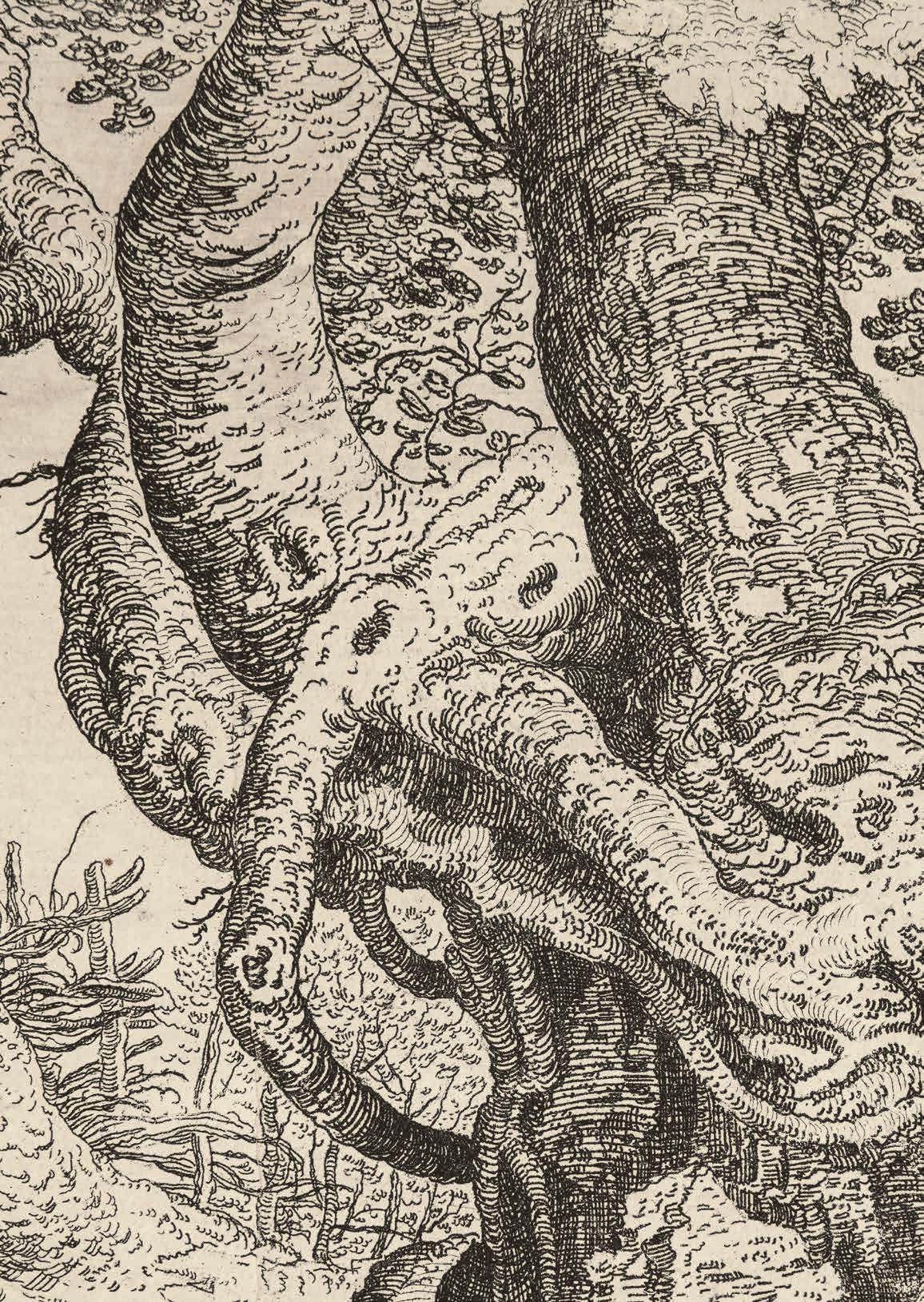 As though, in pursuit of some whimsical fancy, the artist has devised a strictly symmetrical tendril ornamentation which rises from the belly of a satyr. As C. P. Warnke has remarked, Aldegrever may have drawn inspiration for this curious notion from one of the most celebrated ornamental engravings of Agostino dei Musi, called Veneziano (B. 559). Veneziano’s motif of satyr legs connected loosely by a ribbon, mirroring each other in their angled position and pointing in opposite directions, thus forming the point of departure for a fantastical ornamental grotesque, seem to have resonated strongly with the Westphalian master, who confronts us with the belly of a lascivious reclining satyr, legs spread far apart and seen from an unusually low perspective, from whose wildly proliferating pubic hair a tightly organized tendril ornamentation seems to sprout. That Aldegrever cites and paraphrases his Italian model here with great virtuosity is confirmed by his choice of central motif. In place of Veneziano’s head of a Medusa, he sets the mask of an open-mouthed satyr.