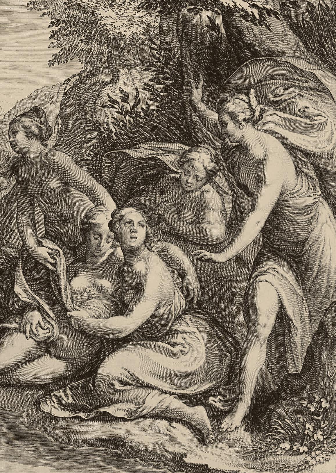 The model, an engraving previously attributed to Boyvin, today unanimously associated with P. Milan, goes back to a compositional sketch by Rosso Fiorentino that is related to a small oval fresco found in the seventh bay of the northern wall of the Galerie François I in Fontainebleau. Small in format, and in contrast to P. Milan’s engraving, the sketch is confined entirely to the circle of dancing nymphs, and hence omits the thematically significant tree at the center of the composition, along with other landscape elements such as the bushes in the background and the flowering meadow. P. Milan executed a detailed preparatory drawing for his engraving, which is preserved today at the École des Beaux-Arts in Paris.
