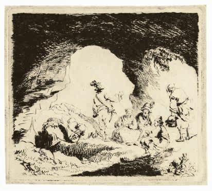 III. The composition has now been intensively revised: the right foreground corner has now been reworked with drypoint, along with the two repoussoir figures. The shoulder area of the male figure is however still white. The strokes in the shadowed area on the cloak of the man who sits in front of the cliff wall that separates the two grotto openings is now more continuous with the white dress of the woman who is seated beside him and the contour of the seated figure in the foreground. The man at the center now intensively reworked with drypoint, along with the figure shown crouching on the floor to his left. The left lower corner, formerly white, has now been covered by strokes that fall from diagonally from left to right, and additionally reworked with drypoint, along with the hitherto still pale portion of the cliff wall below on the left, now accentuated by four short strokes, which now also appears deeply shadowed. The contour of the left-hand side grotto opening has been lowered somewhat below. Still prior to the framing line and the signature. (Winterberg A 18/II)