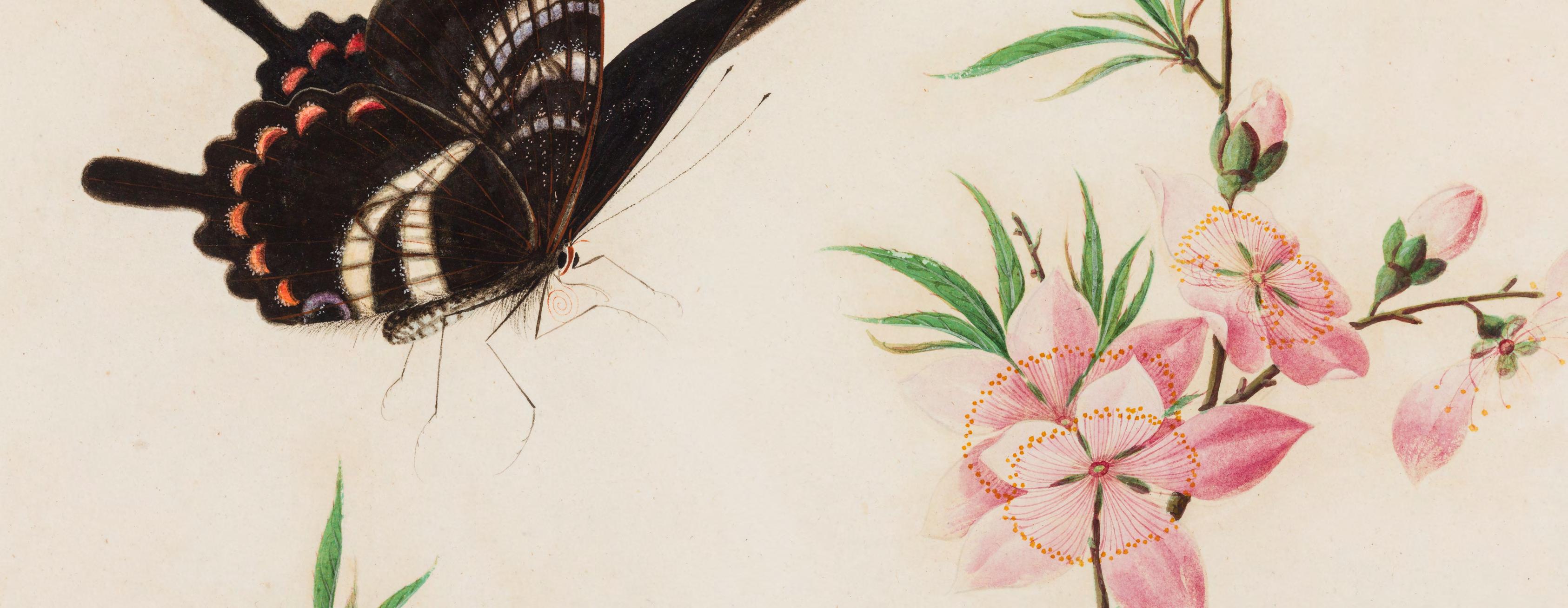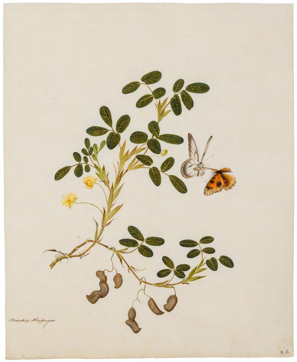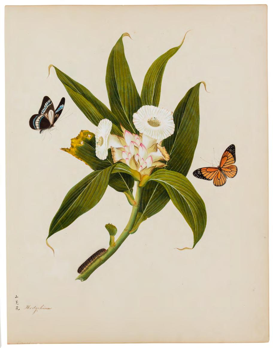 Kerr collection at Kew, and an album of botanical illustrations in the British Library, a sense of Win Achun’s individual artistry emerges. The present group of images attributed to Achun are united in their astounding level of detail, close observation of form, graceful movement and rich colouration. Each study is imbued with vitality and a sense of the plant’s individual spirit. They are nothing short of exquisite. The second group is an exceptional selection of individual plant studies, ranging from a magnificent illustration of a pineapple to a resplendent magnolia. Each work represents a seamless fusion of the scientific with the artistic. The final group includes botanical illustrations with insects, predominantly butterflies.