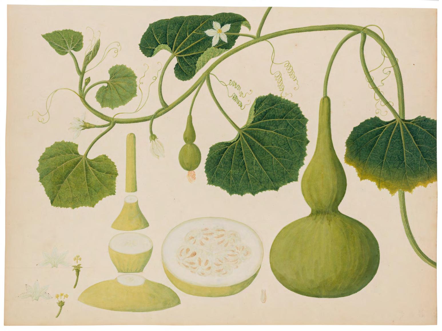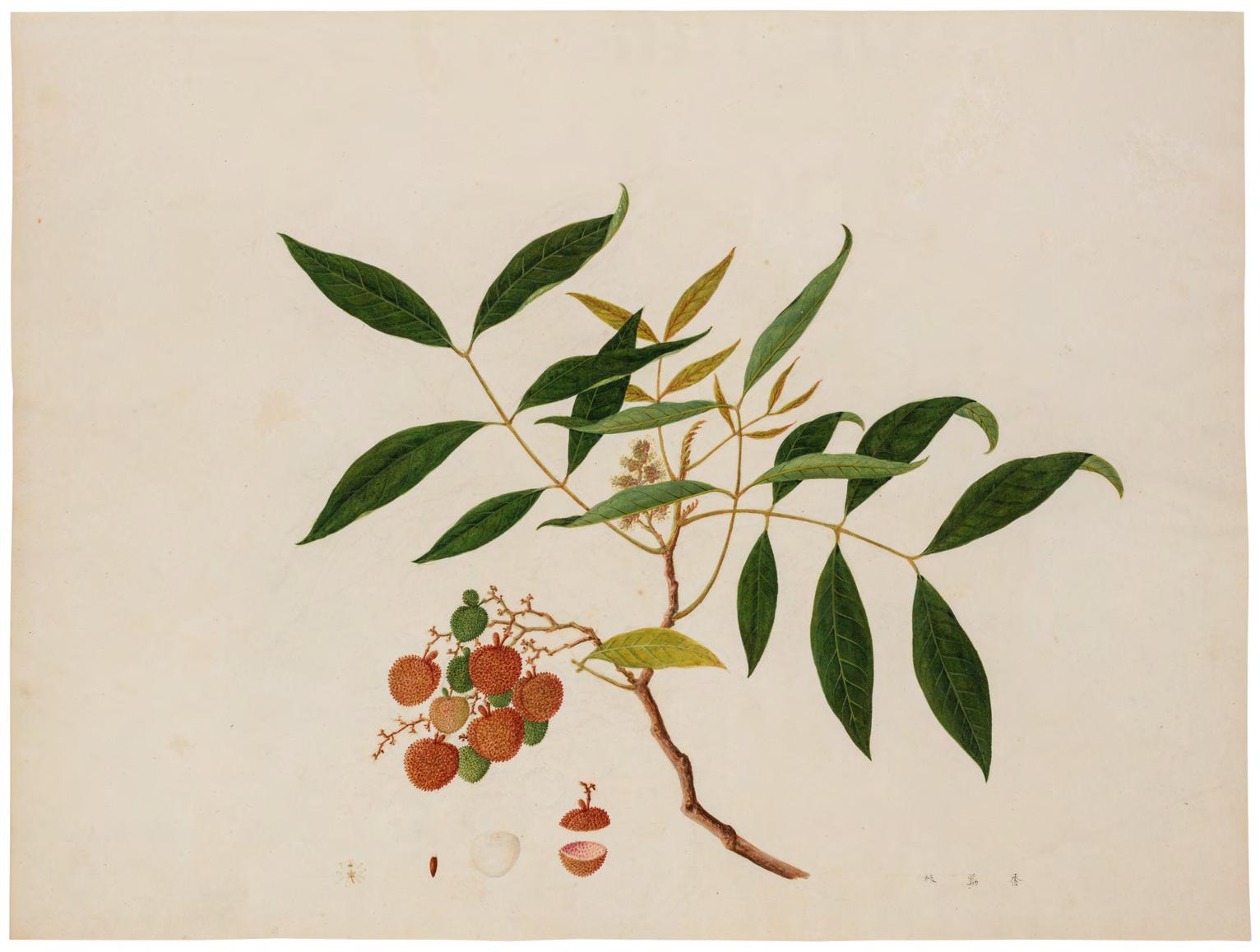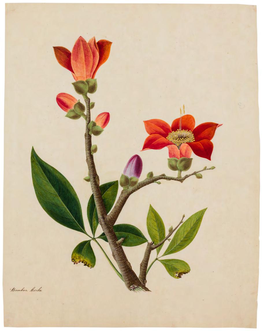 Kerr collection at Kew, and an album of botanical illustrations in the British Library, a sense of Win Achun’s individual artistry emerges. The present group of images attributed to Achun are united in their astounding level of detail, close observation of form, graceful movement and rich colouration. Each study is imbued with vitality and a sense of the plant’s individual spirit. They are nothing short of exquisite. The second group is an exceptional selection of individual plant studies, ranging from a magnificent illustration of a pineapple to a resplendent magnolia. Each work represents a seamless fusion of the scientific with the artistic. The final group includes botanical illustrations with insects, predominantly butterflies.