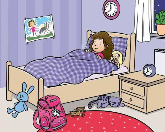 Ja, so sieht ein Schulkind aus. Plötzlich kommt große Freude in Emmis Herz. Ab morgen wird sie ein Schulkind sein! Emmi stellt den Schulranzen direkt neben das Bett. Dann hüpft sie fröhlich in ihr warmes Bett und nimmt Molli in den Arm. Plötzlich ist sie sehr müde. Sie macht die Augen zu und kurz darauf schläft sie ein.