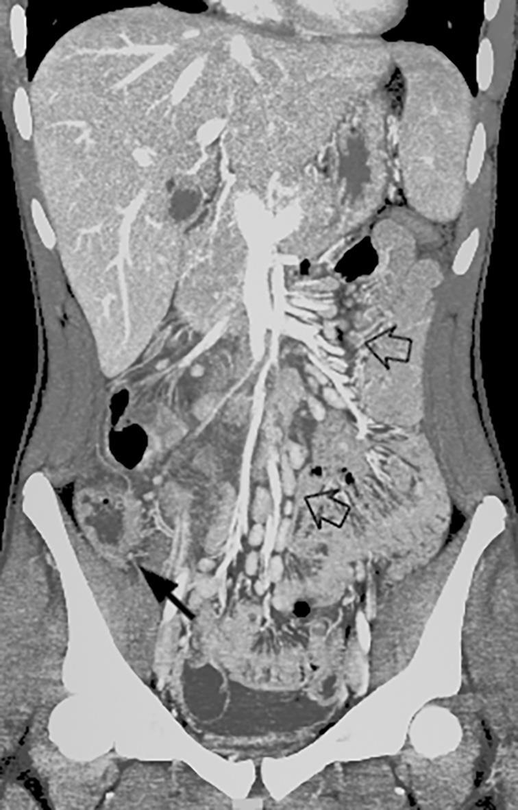 • Anumber of studies have described abdominal imaging findings including ascites, bowel wall thickening and mesenteric lymphadenopathy