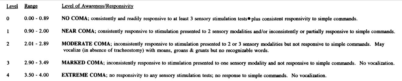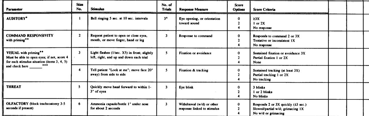 - Alertness (unresponsive, eye opening with/without stimulation, attention).