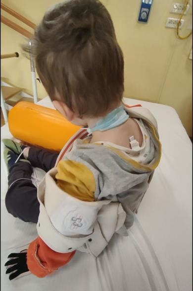 • Severe left upper limb distal hypertonia, clenched fist, functionally excluded;