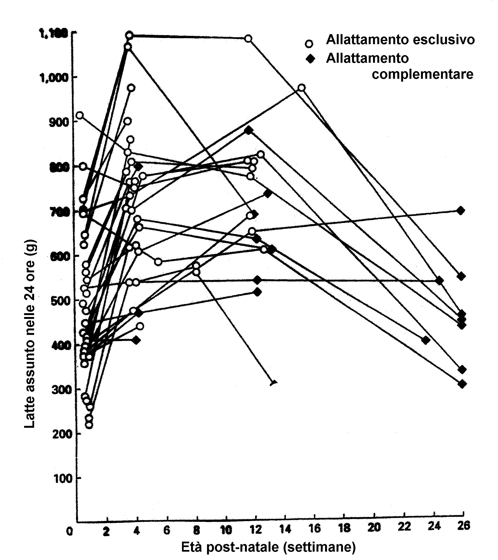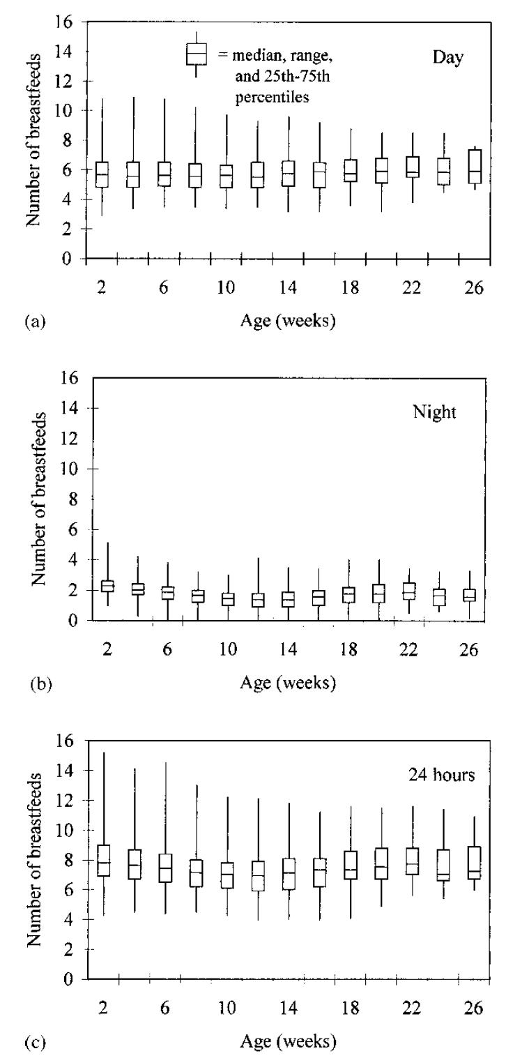 With exclusive breastfeeding, the number of feeds in 24 hours remains almost constant throughout the first 6 months of life
