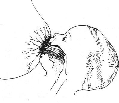 lips asymmetric latch (a larger portion of the areola is visible over the mouth) the chin touches the breast