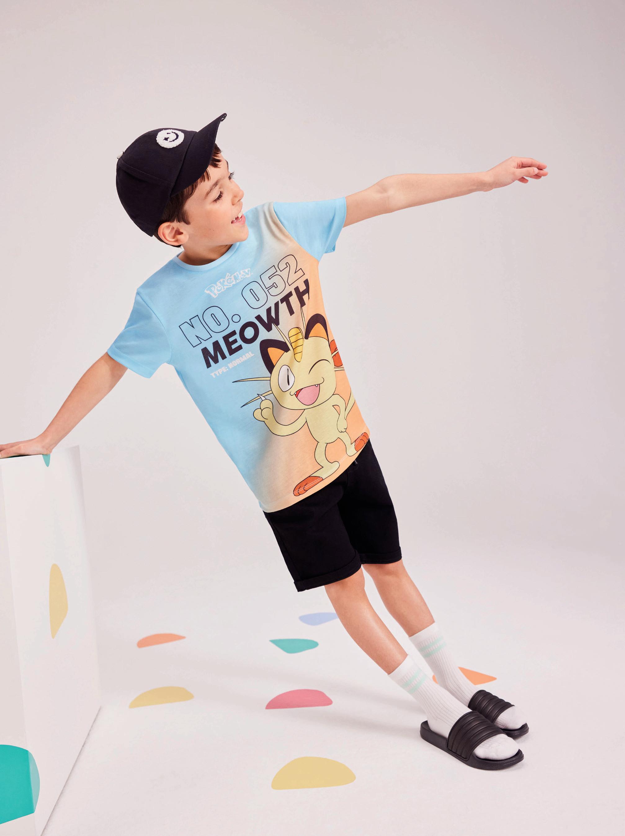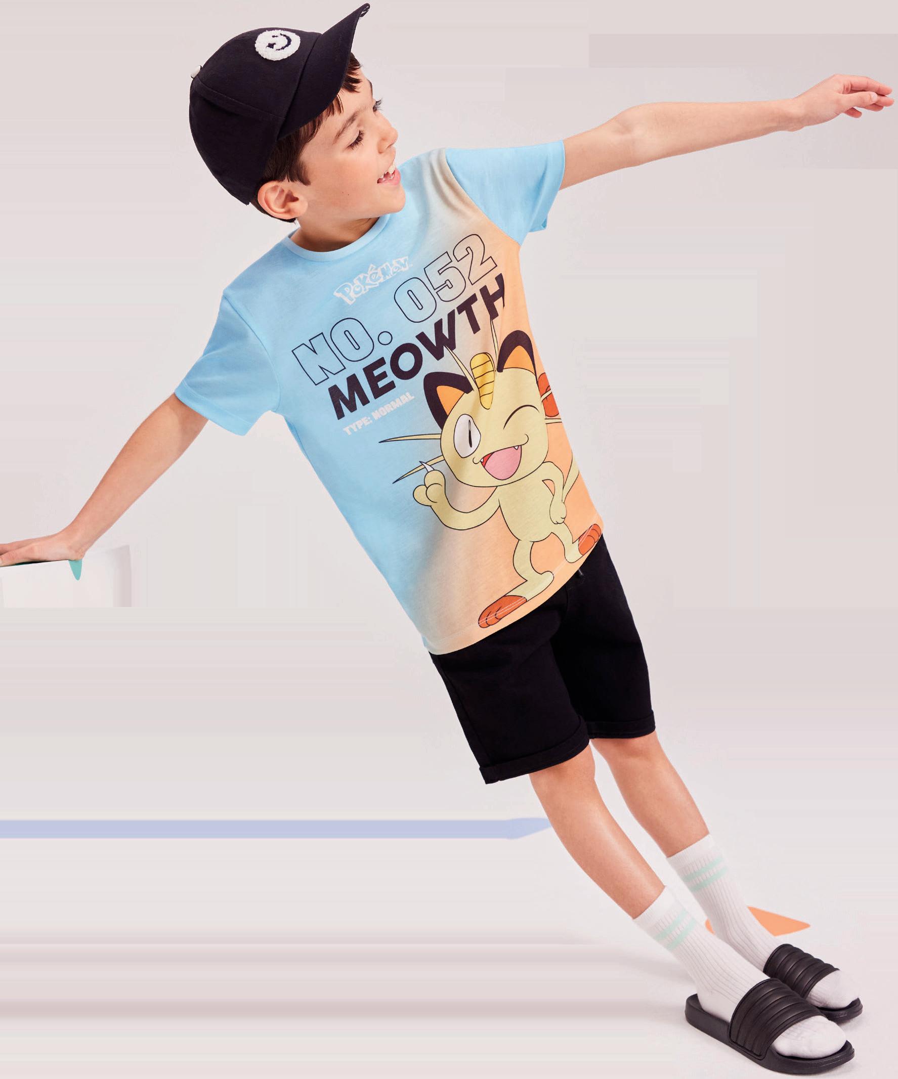 LEFT: Pokemon Meowth Tee (from 5–6 years to 14–15 years), from £7, Black Ribbed Sliders, sizes 12–6, £5
