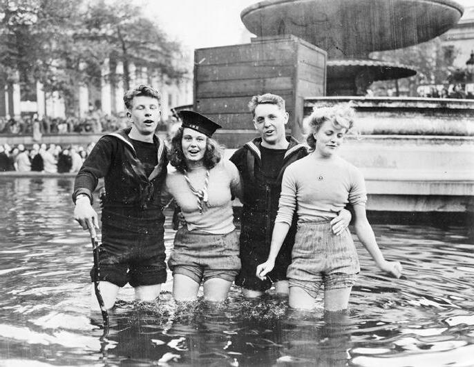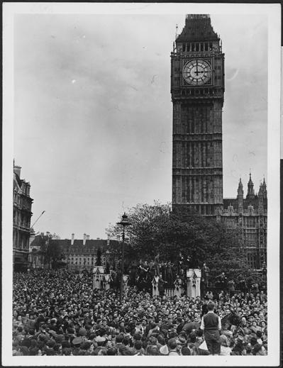 Revelers give the V for Victory sign as they celebrate VE Day outside the Houses of Parliament. ©