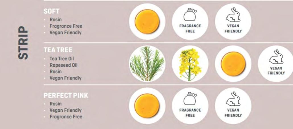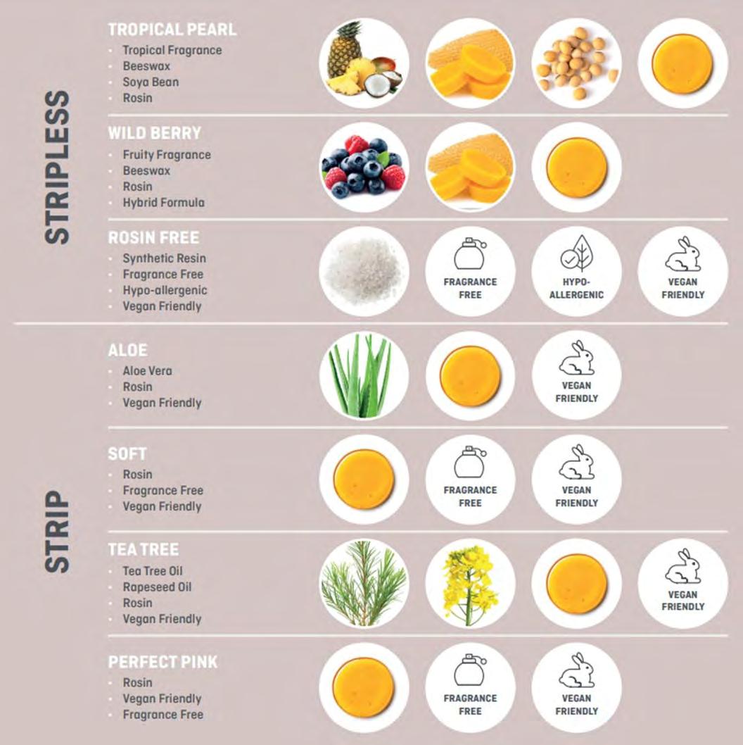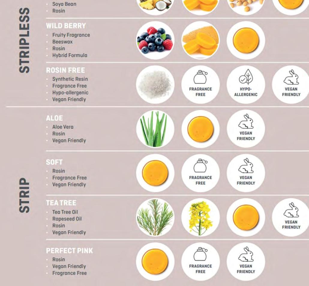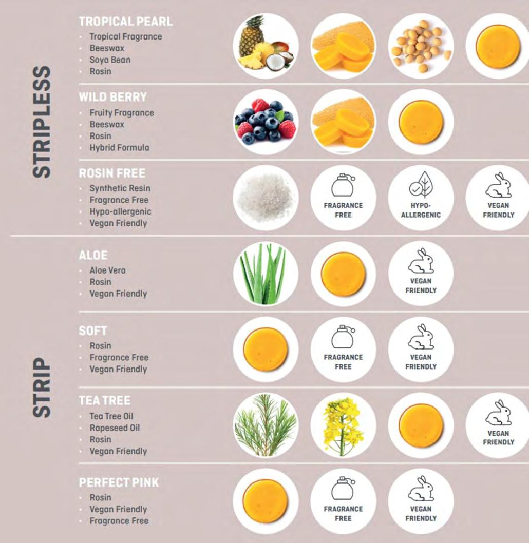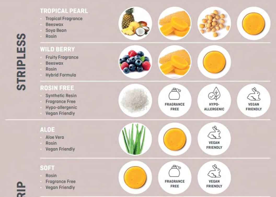 A superior pliable hot film wax with a low allergy risk formulation for use on sensitive skin and intimate areas.