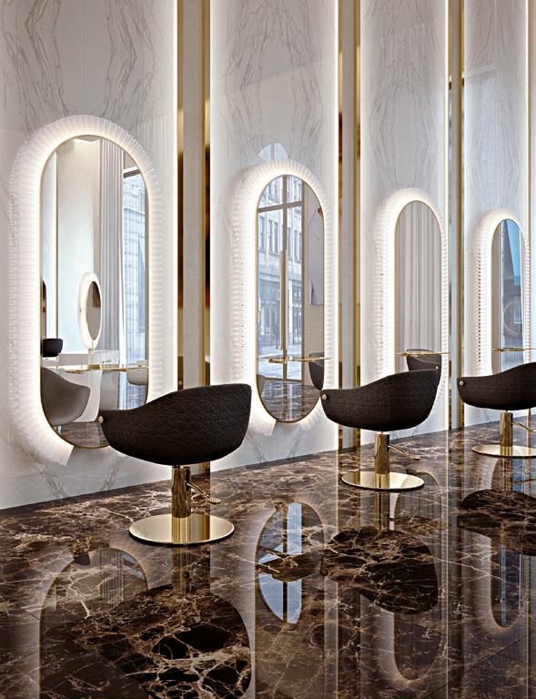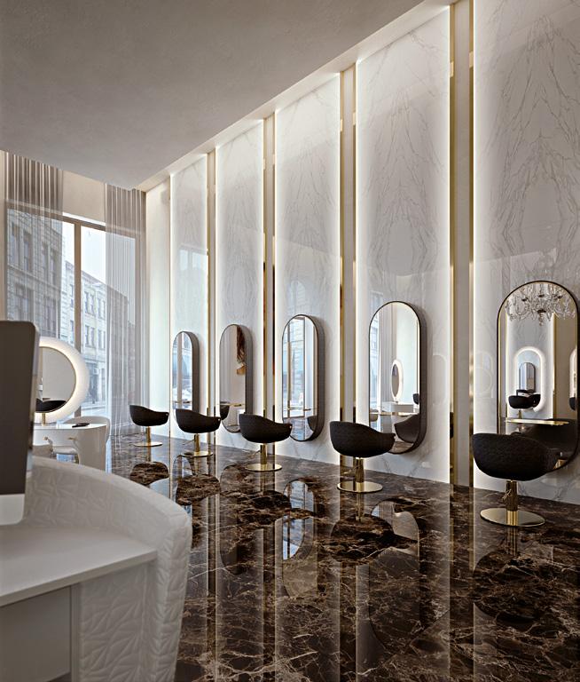 The collection includes an island station, a styling salon chair, shampoo unit with basin, rolling trolleys, a variety of mirrors and a reception desk. The furniture upholstery presents a stitched floral relief that endorses a visual and physical feeling of depth to the guest. All frames and metal pulls are coated in either gold, chrome or matt black colours. “We purposefully designed the pieces in this collection to be versatile and complementary.