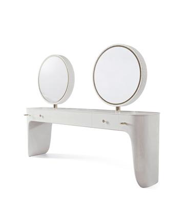 Ogni posto lavoro è stato progettato con una cornice rivestita in skai che aggiunge un particolare accento lussuoso. Attorno, un solido anello circonda l’intero specchio all’interno di un motivo floreale. Questa postazione è disponibile in differenti misure, centrali e a parete.