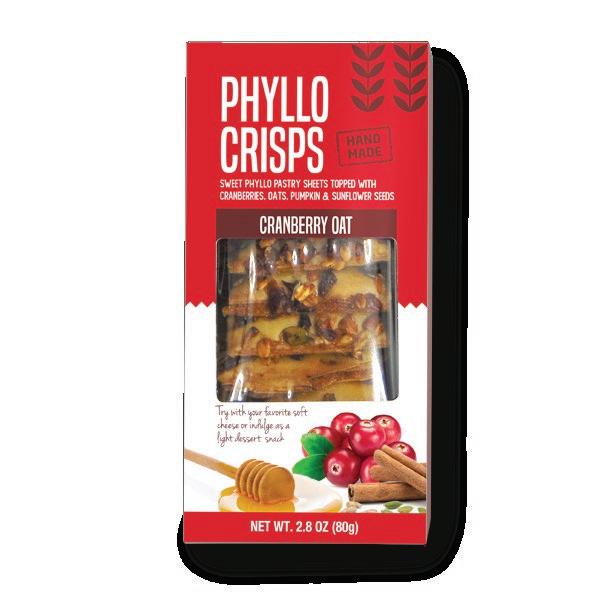 NuBake Cranberry Oat Phyllo Crisps are carefully layered fresh Phyllo douch sheets topped with dried cranberries and jumbo oats. They are cut into bite-size pieces and baked to a perfect golden brown.