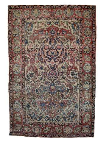 27. W A Kashan rug early 20th century, the red palmette border enclosing a cream field with flowerheads and scrolling foliage in blue, red and pink, length 150cm, width 102cm £100-£200