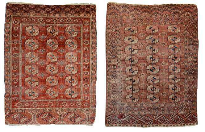 28. W Two Tekke Bokhara rugs late 19th century, one with more geometric borders and a red field with three rows of guls, the other example of similar design, more faded in colour (2), length 157cm, width 119cm, length 150cm, width 112cm £100-£150