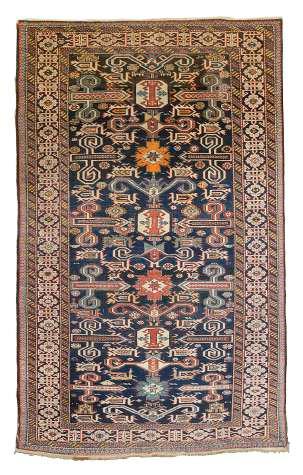 26. W A Caucasian rug early 20th century, the main border with a repeating medallion and enclosing a dark blue field with central star motifs and geometric scrolls, length 181cm, width 101cm £80-£120