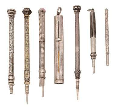 51. A group of seven 19th/20th century small hammers for silversmiths, jewellers and upholsterers, three steel headed examples with turned rosewood handles, one with maker’s name, indistinct, the largest one with a mahogany turned handle, another with an ash handle, also with a steel example and a 20th century steel and brass handled example, unscrewing to reveal a screwdriver (7), largest: length 29cm, smallest 19cm £100-£150