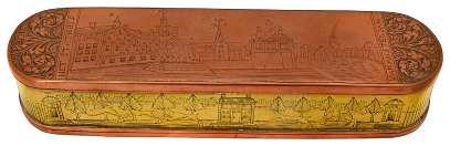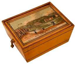 rectangular the hinge cover decorated with a penwork view of ‘Culzean Castle’, the front with a view of Abbotsford House, against a red textured ground, two division interior, covers with ring handles, on gilt brass ball feet, height 14cm, length 22.5cm, depth 13.5cm £150-£250