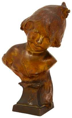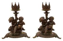 9. A pair of late 19th century French patinated bronze figural candlesticks by Fanniere Freres the trefoil type sconces above fluted stems enclosed by puttae and foliage, the concave lappet clad bases with scrolled feet, undersides stamped,’ FANNIERE Fres’ (2), height 20cm £100-£200