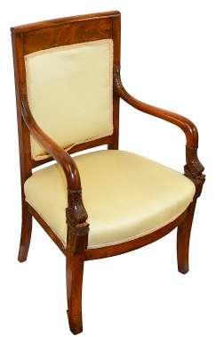 31. W A French Empire mahogany armchair 19th century, with an upholstered back and seat, the scale carved arms ending in marlin arm facings, the bowed seat on sabre legs, height 92, width 61cm £100-£200