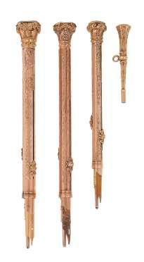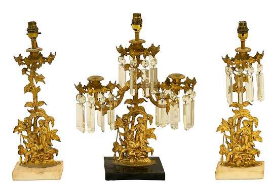 5. A mid 19th century American gilt metal garniture of lustre candlesticks, adapted as lamps Probably Cornelius & Co, Philadelphia, all with branch and leaf form arms, bases comprising arches with two young boys with dogs and fishing rods, the three arm example with a black marble base, the two single examples both with white marble bases, drops lacking to one single example (3), height 51cm £150-£250