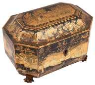 46. Ø A Chinese Export ware tea caddy 1820s/30s, of octagonal form, Chinoiserie decorated and incorporating figures in buildings and landscapes, and dragons, trees, foliage, the rear with a river scene, the interior with two removable chased metal lidded canisters, with further interior ivory ball lids, on paw feet, height 13cm, width 21cm