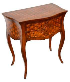 15. W A 19th century Northern Italian parquetry side table decorated with rolling cube marquetry, banded and inlaid with stringing, of serpentine outline and with two drawers and cabriole legs, height 78cm, width 74cm, depth 44.5cm £200-£300