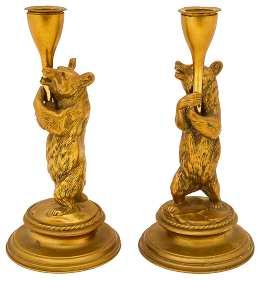7. A pair of Victorian brass bear candlesticks cast naturalistically with red glass eyes standing holding aloft detachable sconce with drip pans engraved to drip pan rims ‘Toulmin & Gale,’ 7 New Bond Street, on circular socle bases, height 22.5cm £80-£120
