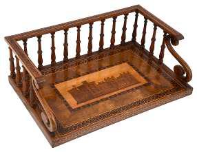 three quarter turned spindle gallery with scroll ends, the top rail inlaid with micromosaic border, the base inlaid with a mosaic panel depicting the State Apartments, Windsor Castle within geometric and walnut banded borders, height 13.5cm. length 38.5cm, depth 25cm £200-£300