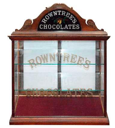 40. W A Rowntree’s Chocolate glazed display cabinet late 19th/early 20th century glazed advertising shop display cabinet, carved pediment with inset glass picture of a cacao pod surrounded by ‘Rowntrees Chocolates’ including two plate glass shelves, sliding glass doors to the reverse, makers seal to the reverse ‘O.C. Hawkes Ltd Manufactures globe works Birmingham’, Approx. width 82cm, approx. height 96cm. approx depth 43.5cm £600-£800
