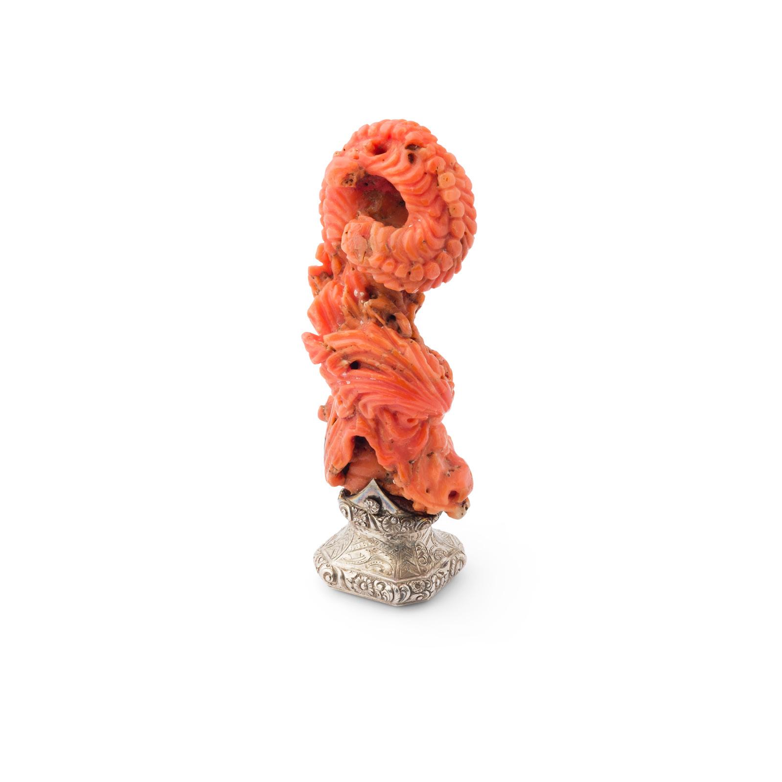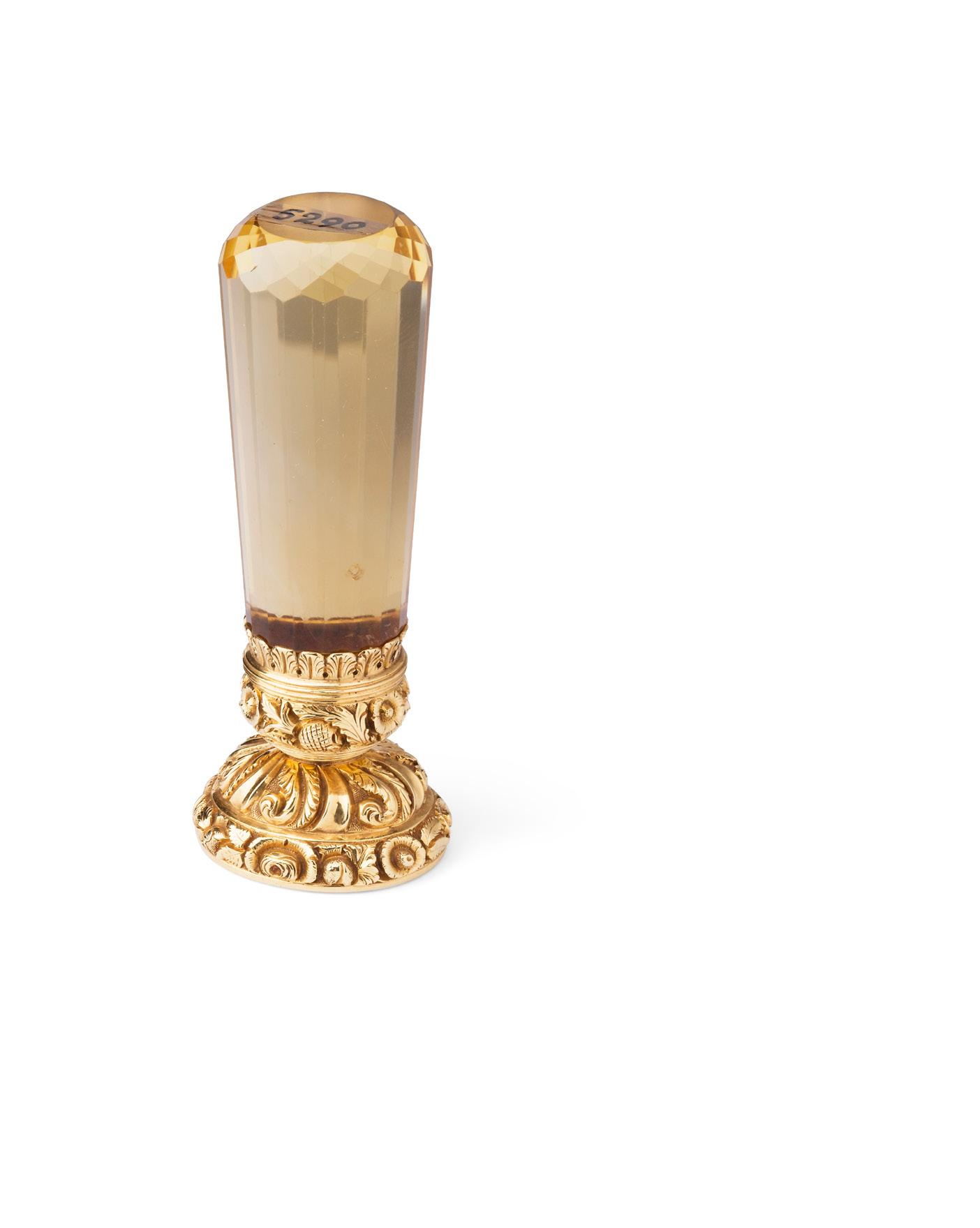 The facetted aquamarine handle, mounted in silver with an oval matrix, with engraved cypher in a scroll border