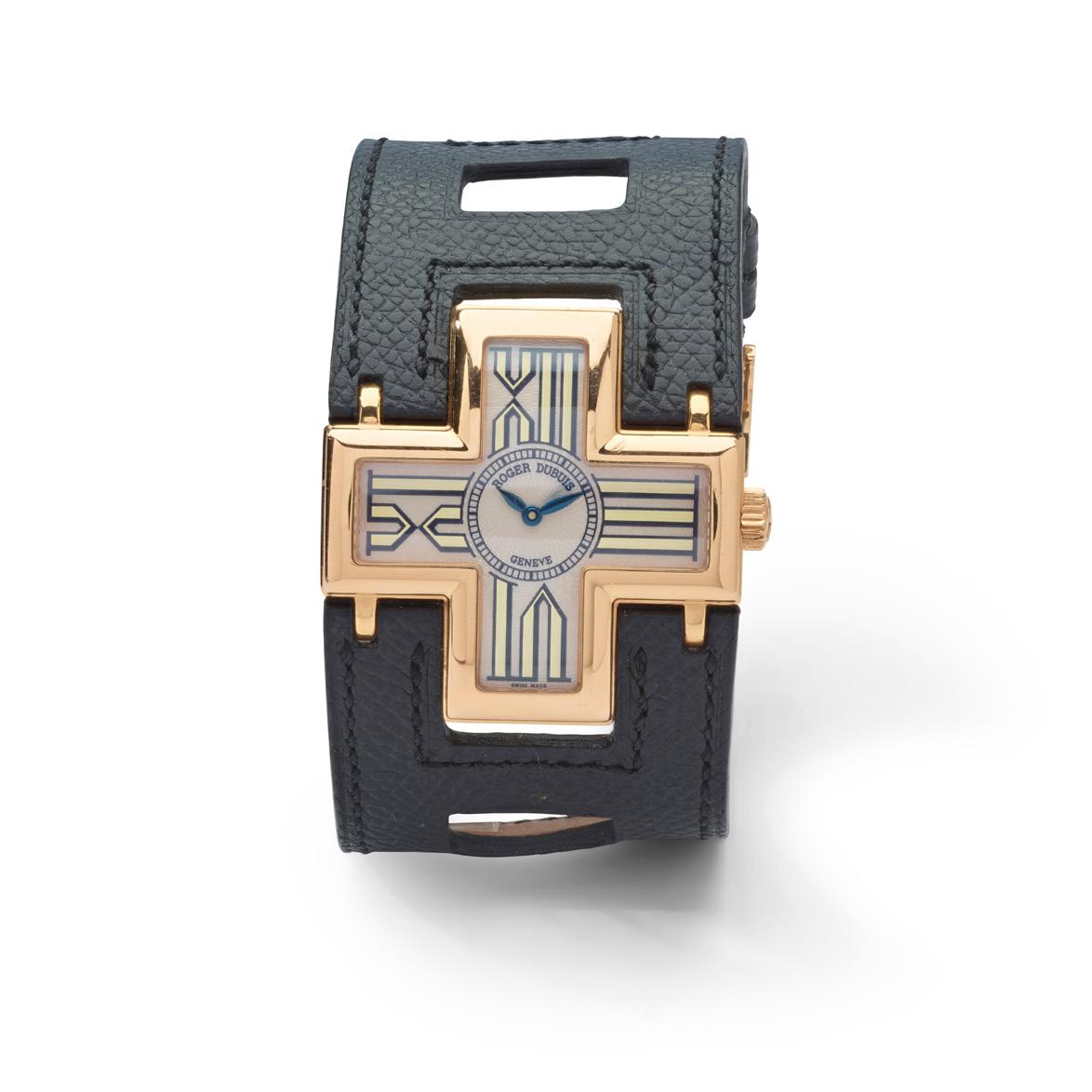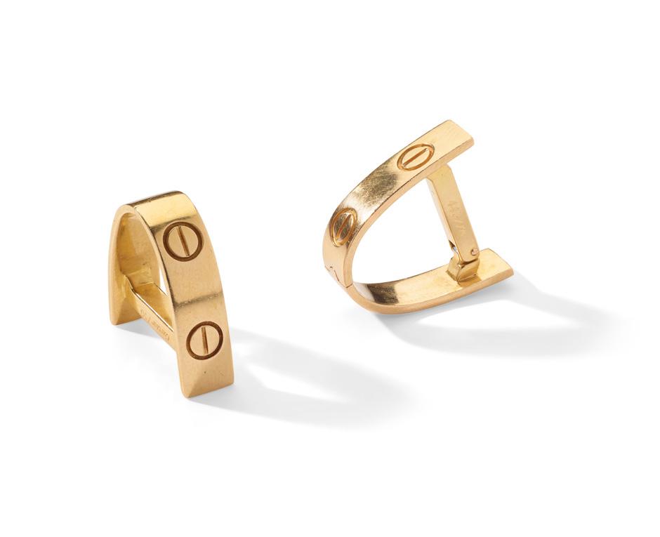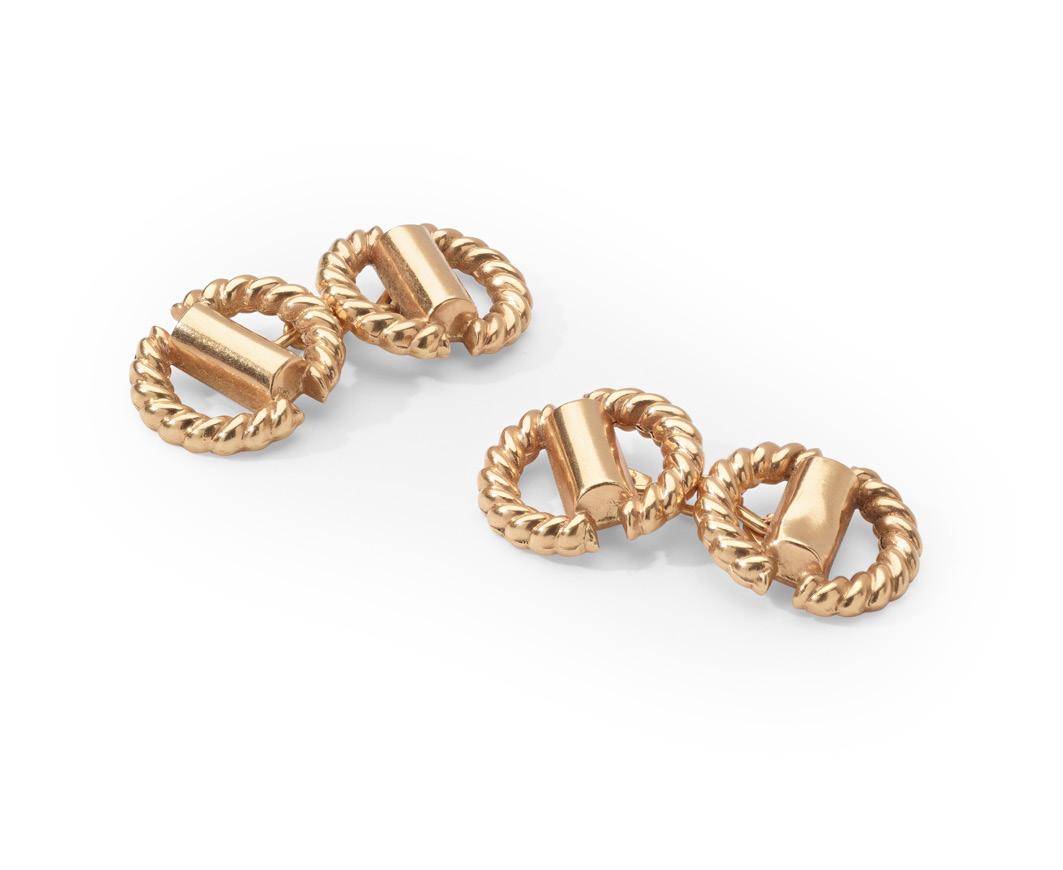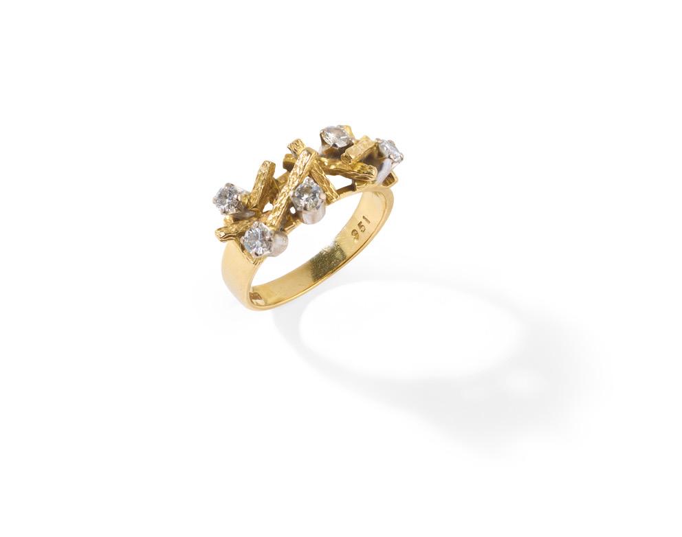 Set with five brilliantcut diamonds, between overlapping textured 18ct gold batons, maker’s mark