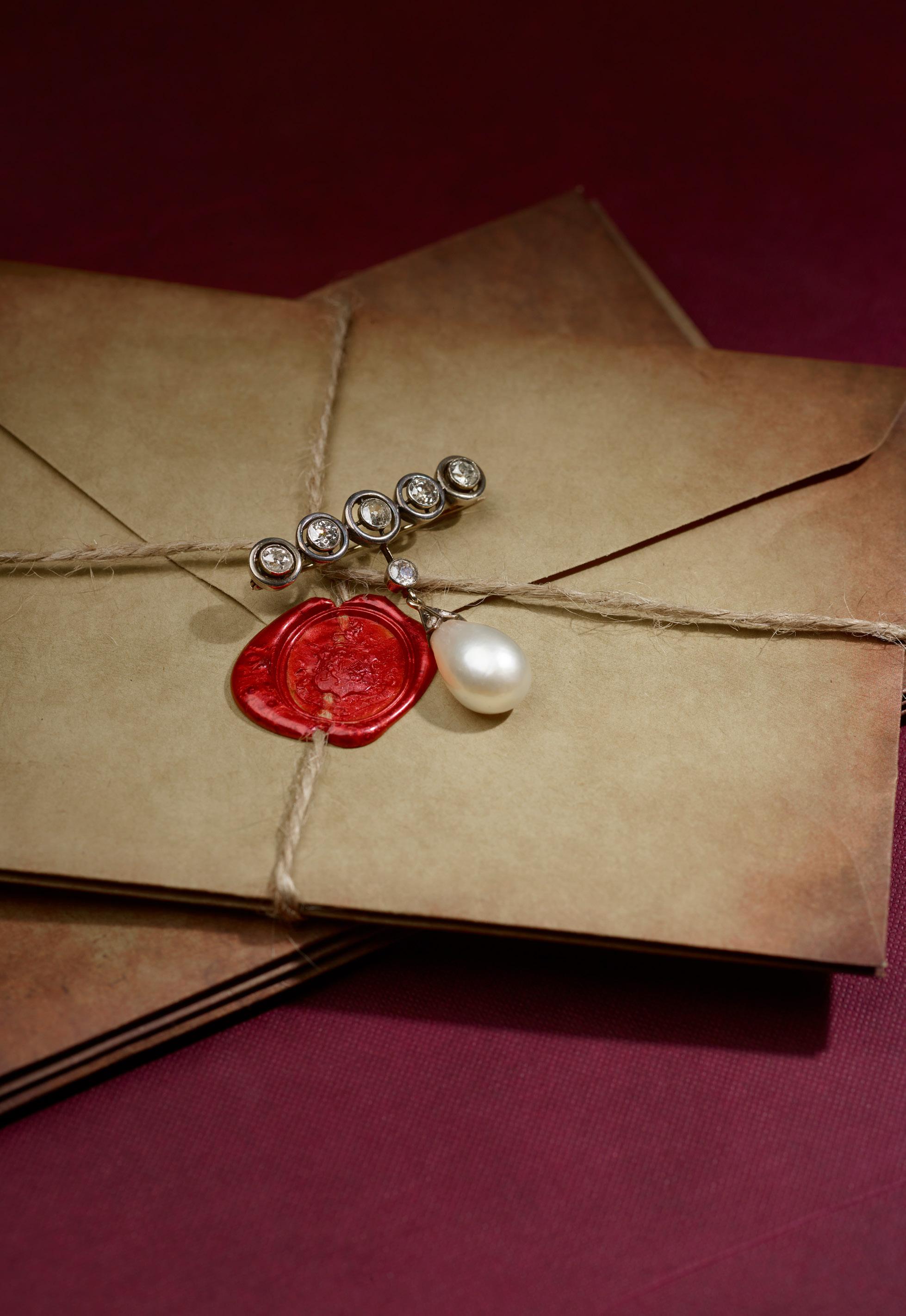 The drop-shaped pearl, measuring 10.311.8 x 16.2mm, with a single-cut diamond cap, to a millegrain-set old brilliant-cut diamond five-stone bar brooch in polished halo surrounds and diamond connector