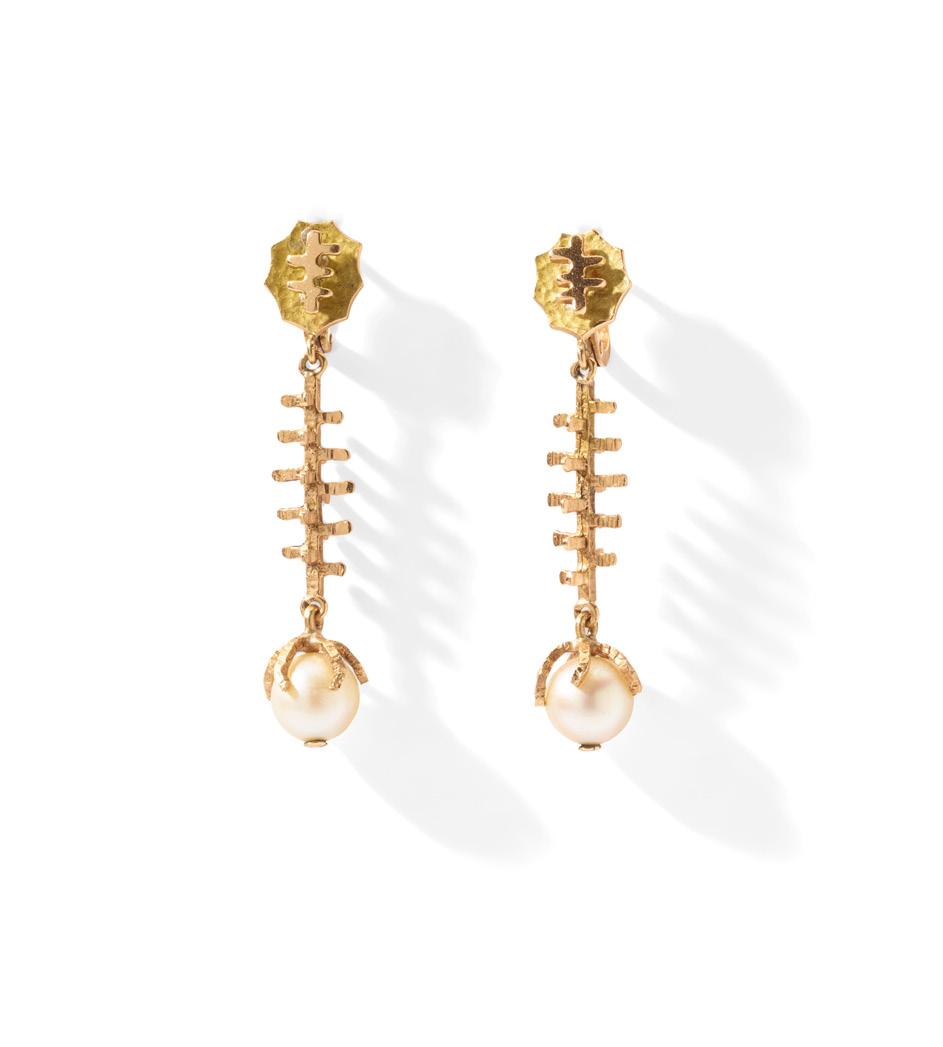 Each cultured pearl with a textured claw mount, to a four-sided textured rod connector and tiered abstract design surmount, post fittings, Dutch marks