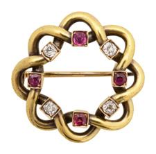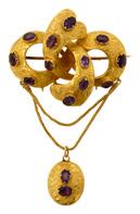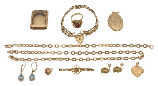 14. A collection of gold, silver and brass vertu comprising a printed portrait roundel of a young lady, in an 18ct gold case, with hair to the reverse, another similar example of an older lady, a silver brooch marked 800, a silver toothpick, modelled as a horse, marked 925, a silver gilt hat pin modelled as a fox, with red glass eyes, two small gold brooches, inset with red paste stones, and plaited hair, a blue cased glass snuff bottle, and two brass pipe tampers (9), the snuff bottle 8.5cm